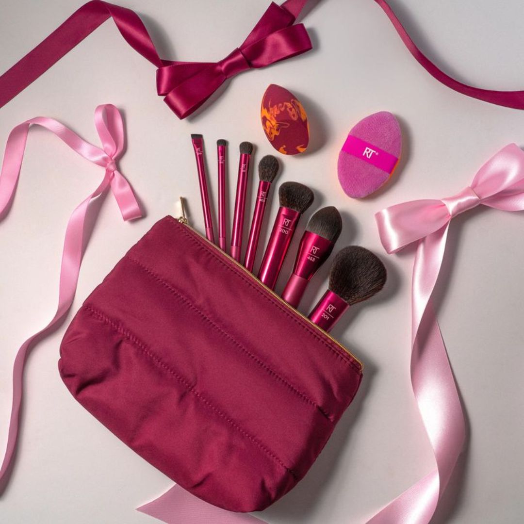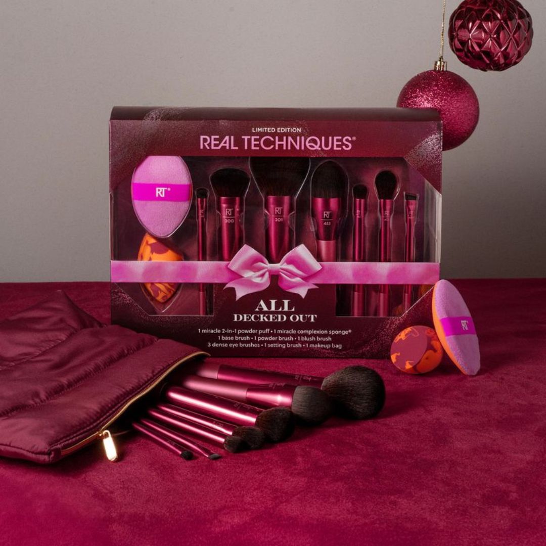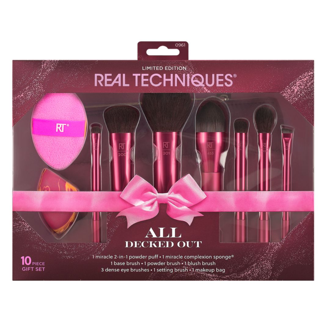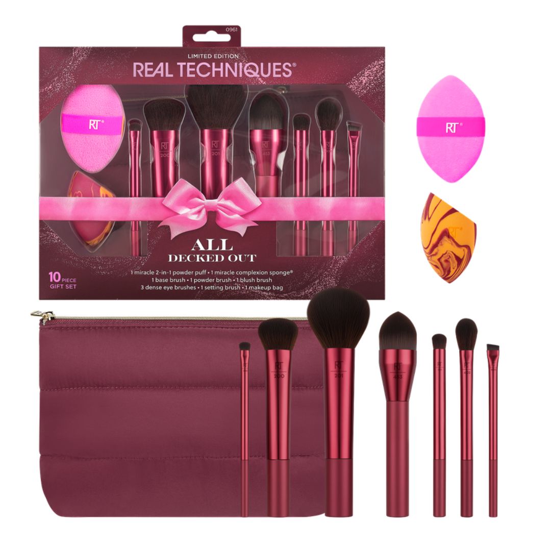 Real Techniques All Decked Out SetThe Real Techniques All Decked Out Gift Set is the ultimate holiday gift, featuring nine essential tools for creating a flawless full-face look. It includes a selection of premium makeup brushes, two blending sponges, and a chic makeup bag — perfect for achieving effortless glam this festive season.