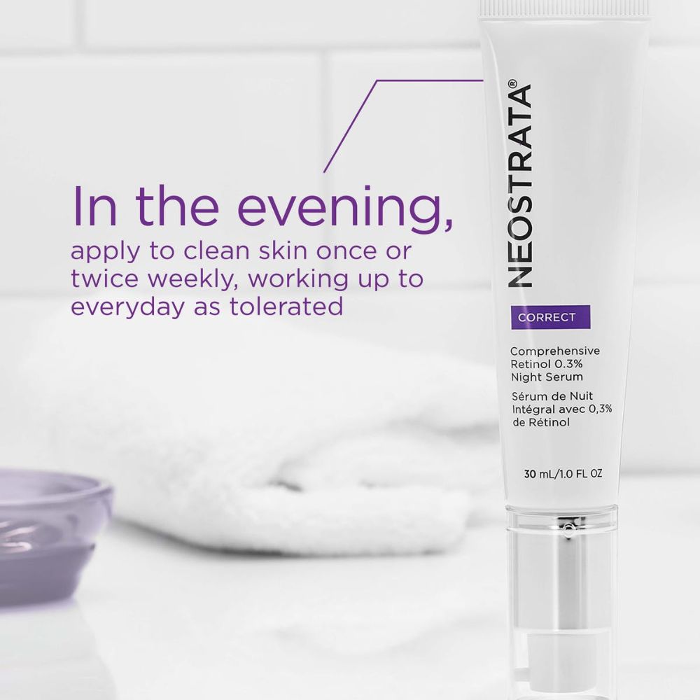 Target your skin’s elasticity while you sleep! Regenerating. Rejuvenating. Reinvigorating. Featuring three potent ingredients for three powerful results; this potent nighttime serum helps diminish uneven tone, smooth the look of coarse wrinkles and promotes visible firming with Retinol, Hyaluronic Acid and NeoGlucosamine. This lightweight serum leaves a smooth, non-greasy feel and is the ultimate go-to for antiageing concerns: from wrinkles and dull texture, to dark spots and loss of firmness, this Comprehensive Retinol 0.3% Night Serum is here to help.